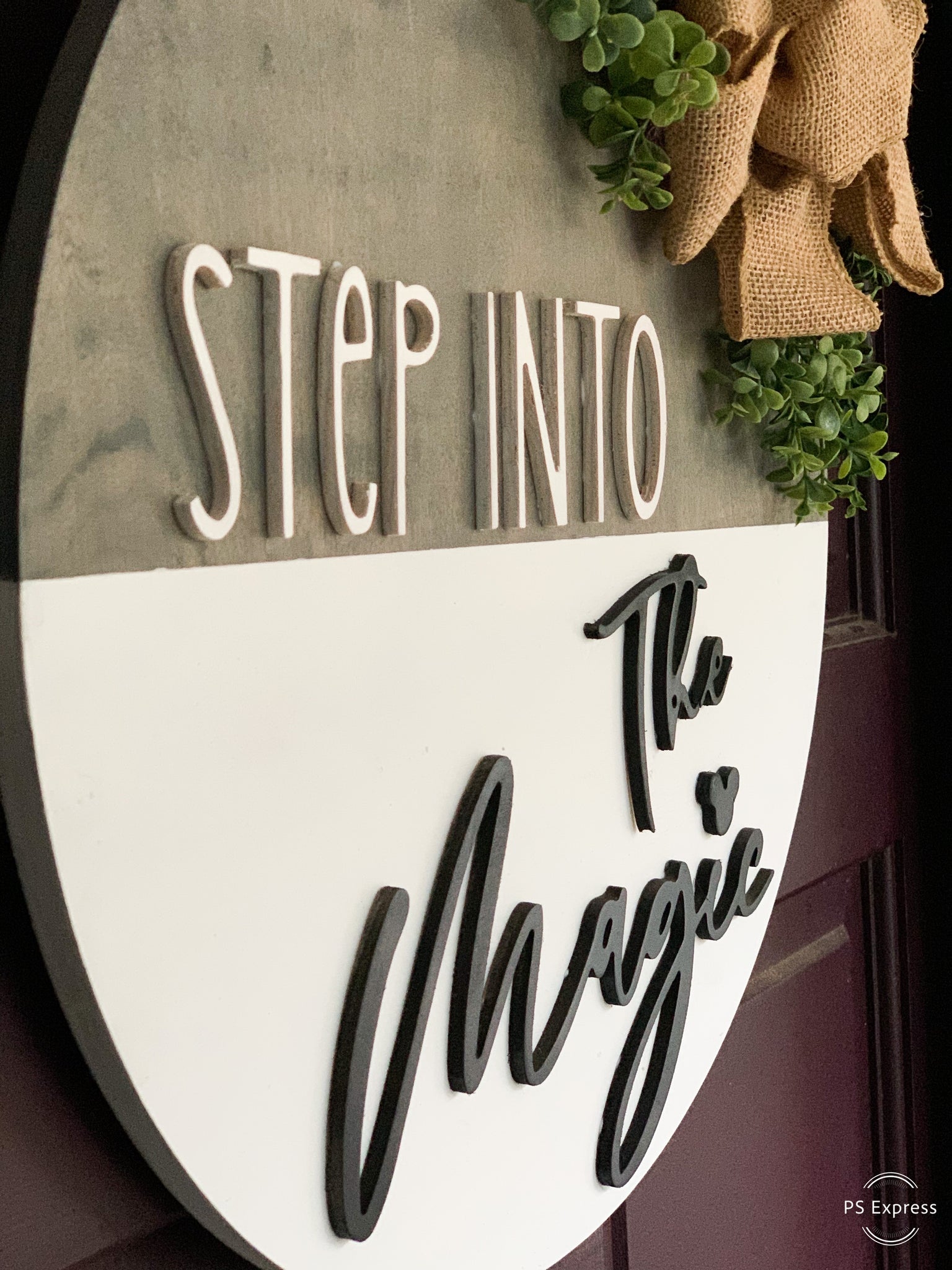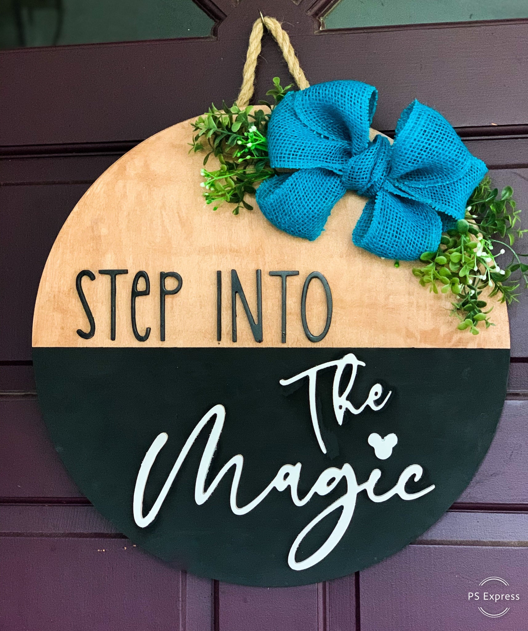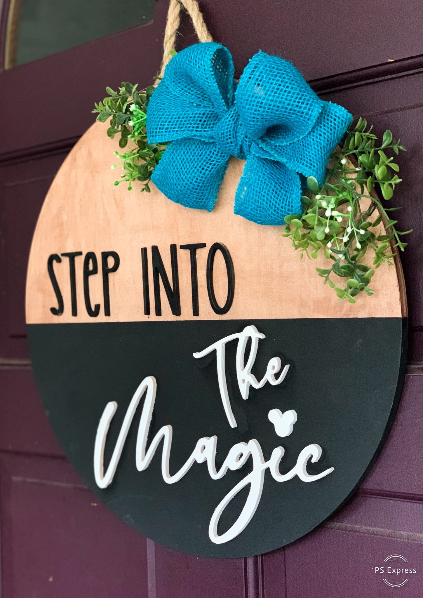 ‘Step Into the Magiiiic!’ For many of us, just seeing this sign brings back memories of Disneyland Forever Fireworks...a show that turned us all into a kid no matter what your age. This 18 inch Door Hanger pays tribute to our favorite fireworks show, while also inviting your guest to step into your own little brand of magic as they enter your home or office. Made from 1/2 inch thick Maple hardwood material, 1/4 inch thick 3D lettering, a rope hanger, and finished with a burlap bow and greenery, this Door Hanger is the perfect way to add a Magical touch (and the hidden mouse) to your life. So go ahead...Step into the Magic! You won’t be sorry!